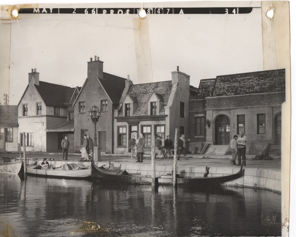 Even the roof is slotted and glass. Painting can be done at night and lighting used on sets helps light these backdrops inside this department. In the day time, existing day- light is sufficient.The studio water tank for filming actors swimming while the camera never gets wet…This was removed a few years back. It sat at the base of the side of the Art Building that has all the windows.This area doubled as a prison in Paul Newman’s- Somebody Up There Like’s MeThe bottom of this picture is the live half. The top is a matte painting. This scene took place on Lot 1 below the scenic art building. Soylent Green 1972The scenic art building in a matte painting in Air Raid WardensThe Overland Gate expansion. This picture is taken from upstairs in the Filmways building across the street. It is the Sony Studio’s west entrance today. It was still MGM when this was taken. It is a construction entrance only at that time. The right side of the photograph has an edge of the scenic building. The movie sign above the studio, left of the water tank has the title… Why Would I Lie ?Hopefully, The Clock never strikes Mid-night at this legendary Scenic Artist Facility that almost secretly ignores time…