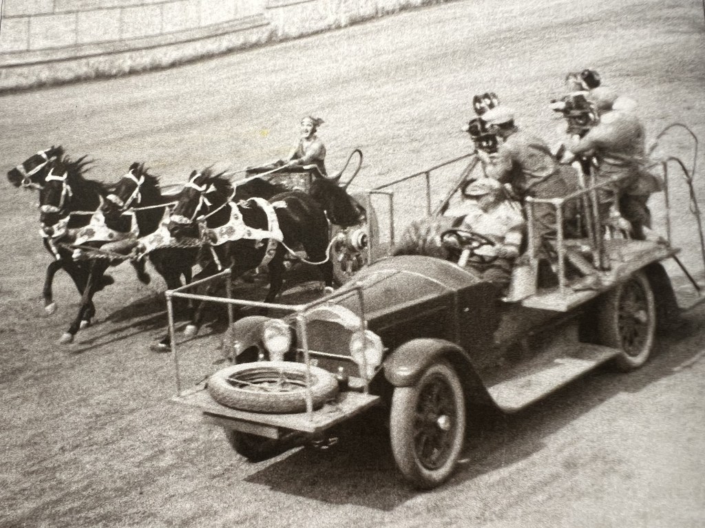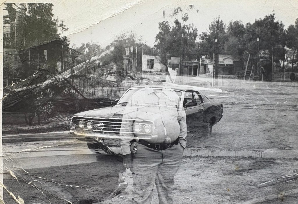 MGM Security handed off the backlot to this gentleman-Lewis Hunt. Cowan Security was in over its head and a huge fire took place burning the church and half of Maple Street. In this double exposure, the church lays in ashes as Lewis tells us Gospel passages. standing in front of his cruiser….1976