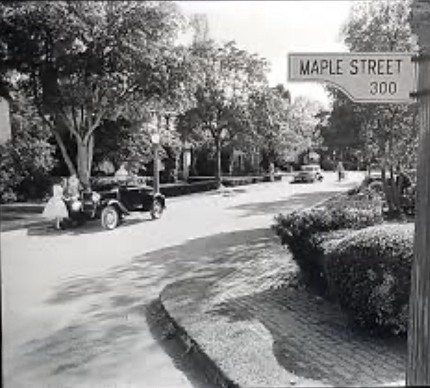 1973 version of a street we called Maple Street, from the Twilight Zone Series. We snuck in with a beat up-Black and White T.V and managed to get good reception with bent and broken antennas. We watched that 1 dimensional episode on T.V in a 3 dimensional colored setting where it was filmed in Andy Hardy’s house.