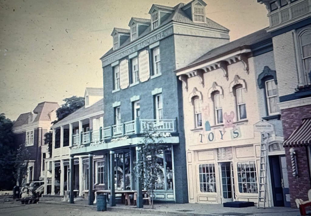 The Yellow home is the Hardy House North side that use to overlook Small Town Square, here being moved as to block view of Vets Tower and an oversized prop warehouse. Walk through the front door and nothing exists-drapes hide-nothing inside.