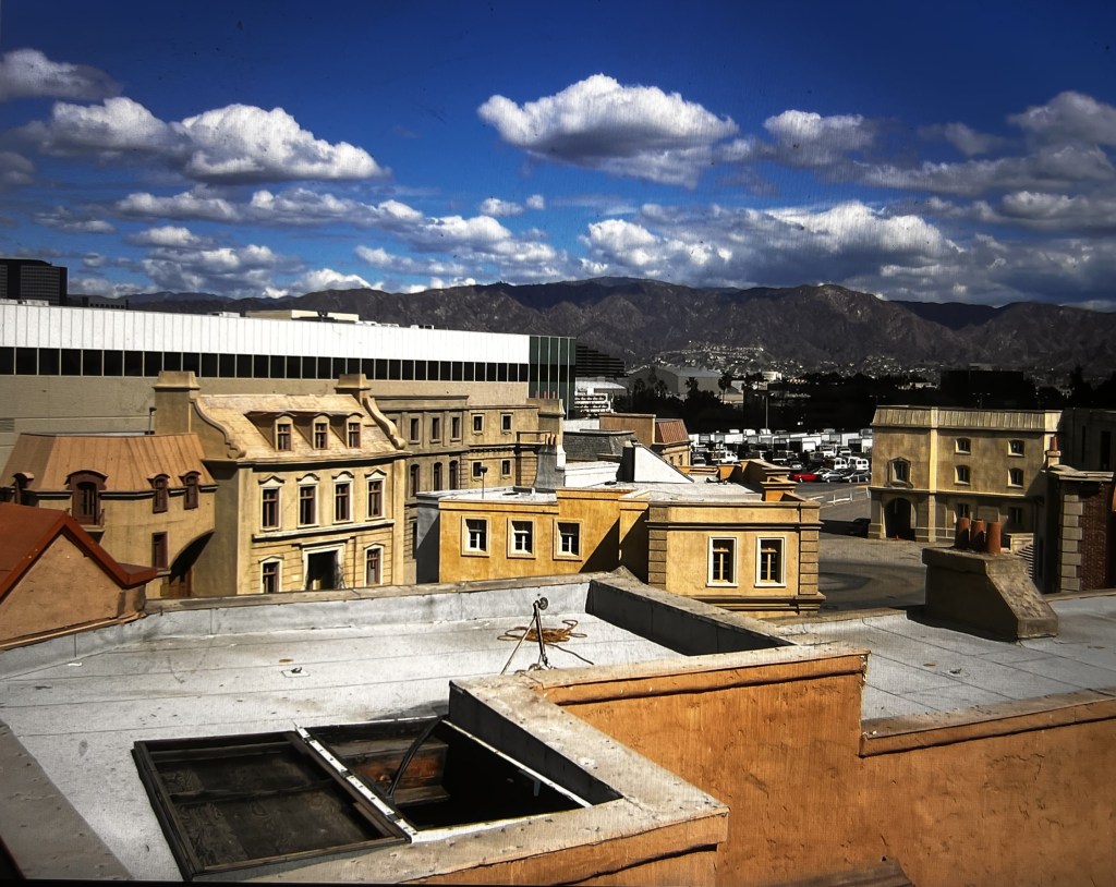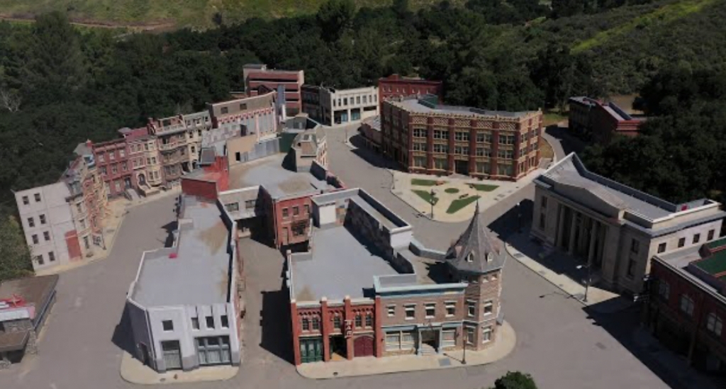 The rooftop of the courthouse in Small Town Square is located at the center most point of the lot.This roof is equal in distance to the fence in almost every direction.This is dead center of thislot-Looking North.Andy Hardy’s House is behind the Arco sign,the opposite side is the Hardy front door.Pictures taken on a windy afternoon on the MGM backlot from the same rooftop…