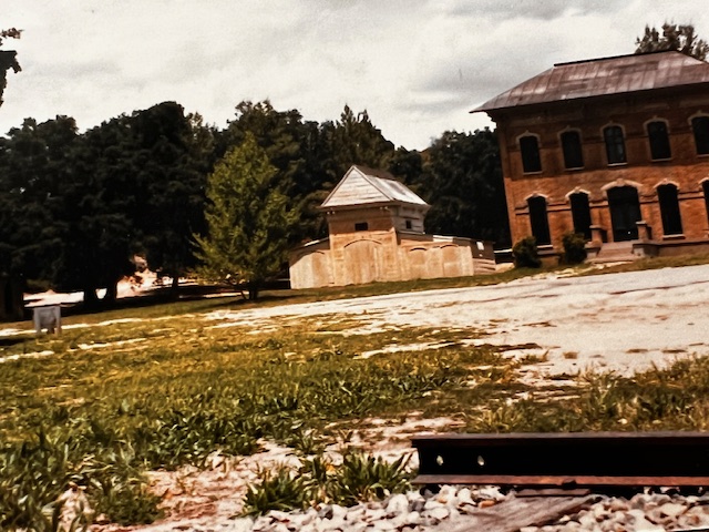 We’re leaving the Train Station and off to the cemetery! -There is a fence in this picture laying on the ground, white and dented, a car crashed through it. It was a traffic accident, not a stunt. Imagine crashing your car on the backlot. I’d keep driving around, leave out the main gate. The studio added a replacement fence. Funny enough, it was the side of a ship. It had port holes to look into the studio. That’s the story behind this picture. Look closely, the rear of the train has a guard getting out of the Red Bronco. They patrol this area knowing this is our favorite way in.