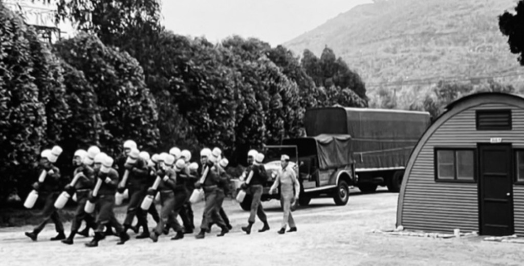 Even the roof is slotted and glass. Painting can be done at night and lighting used on sets helps light these backdrops inside this department. In the day time, existing day- light is sufficient.The studio water tank for filming actors swimming while the camera never gets wet…This was removed a few years back. It sat at the base of the side of the Art Building that has all the windows.This area doubled as a prison in Paul Newman’s- Somebody Up There Like’s MeThe bottom of this picture is the live half. The top is a matte painting. This scene took place on Lot 1 below the scenic art building. Soylent Green 1972The scenic art building in a matte painting in Air Raid WardensThe Overland Gate expansion. This picture is taken from upstairs in the Filmways building across the street. It is the Sony Studio’s west entrance today. It was still MGM when this was taken. It is a construction entrance only at that time. The right side of the photograph has an edge of the scenic building. The movie sign above the studio, left of the water tank has the title… Why Would I Lie ?Hopefully, The Clock never strikes Mid-night at this legendary Scenic Artist Facility that almost secretly ignores time…